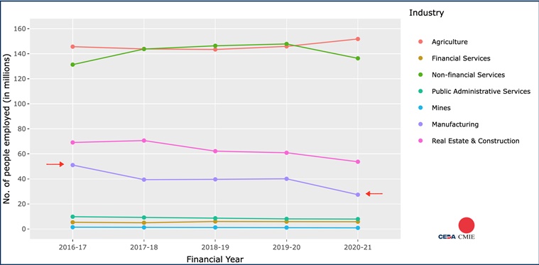 For the longest time, India has struggled to get its manufacturing industries to create a growing bank of jobs. But, and this is what the CMIE data shows, what is happening in the past 4-5 years is that far from soaking up excess labour from other sectors of the economy, manufacturing is actually letting go of workers.