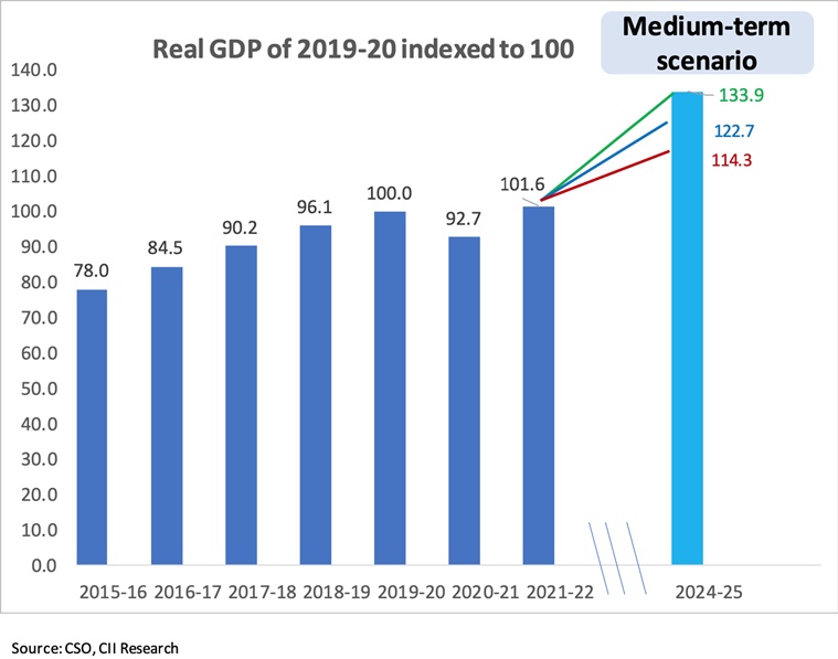 As such, while it is true that India’s GDP will grow in the coming years, CII suspects the GDP growth rate could vary widely between 5% per year and 9% per year (the chart below) depending on several factors such as fresh stimulus, new reforms, and the state of the global economy.